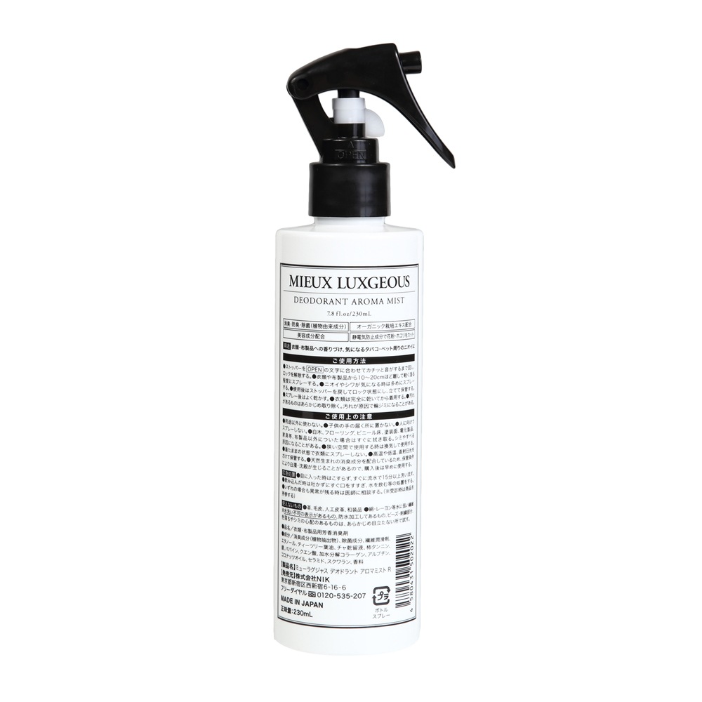 植物由来の消臭成分柿タンニンやティーツリー、チャ乾留液などの天然由来成分6種を配合。1本で消臭・芳香・衣類の静電気防止(ホコリ・花粉を防ぐ)・しわ取りまで。